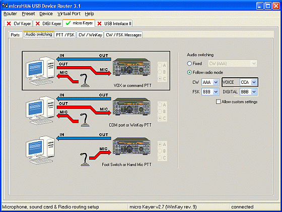 functions (Audio routing, PTT mode, CW transmission, FSK transmission, WinKey settings,